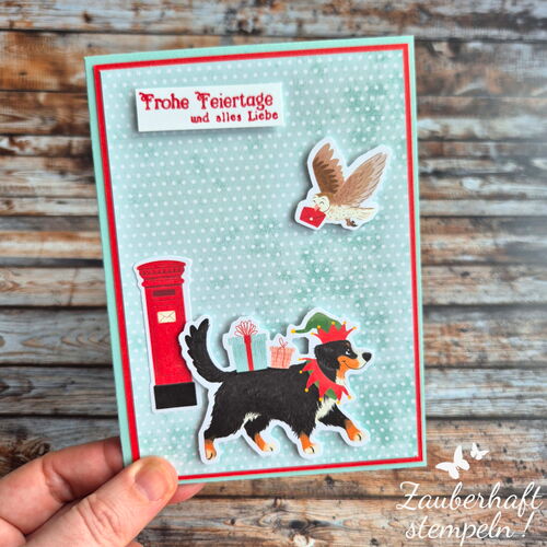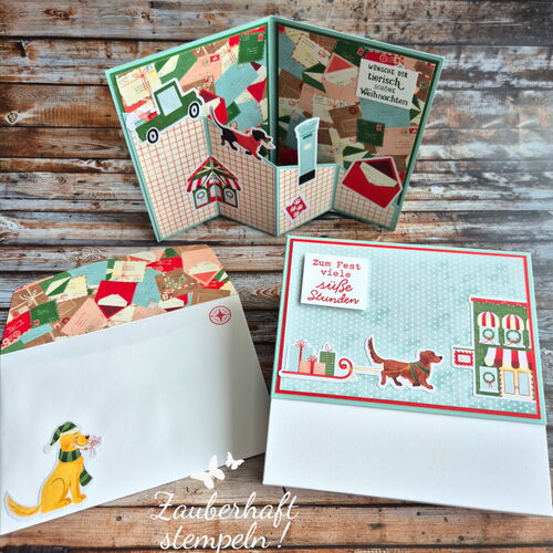 ❄️ Weihnachtsset – Designerpapier ZUSTELLUNG VOM NORDPOL, Stempelset FRÖHLICH ZUGESTELLT und WEIHNACHTSFREUDE IM GLAS. Passend zum DSP habe ich die Farben AQUAMARIN, BLUTORANGE und GARTENGRÜN verwendet.