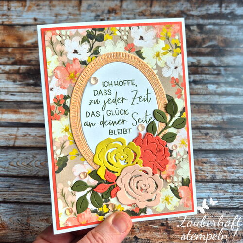 🎉 Geburtstagsset – Designerpapier GEMALTE SCHÖNHEIT, Stempel und Stanzen GERAHMT MIT BLUMEN, Stempel ALLES GLÜCK, Stanzformen BEZAUBERNDE GRÜSSE und Stanzformen TRADITIONELLE ETIKETTEN. Passend zum DSP habe ich die Farben KÜCKENGELB, WALDMOOS, BLÜTENROSA und CALYPSO gewählt. Das besondere Etwas - Glitzerpapier in BLÜTENROSA für die Geburtstagszahlen.