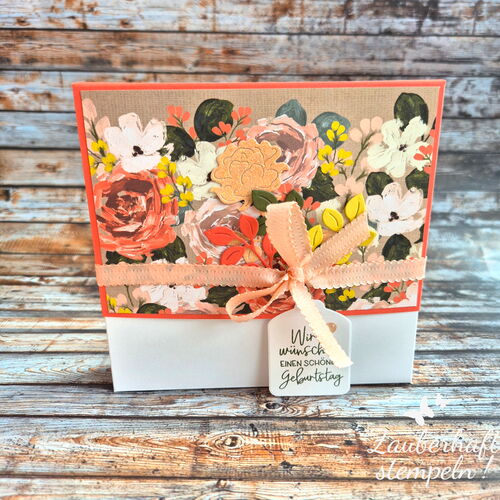 Die Karte poppt diagonal auf, lässt sich hinstellen und bietet Platz für persönliche Grüße. Die Karte sieht aufgestellt so toll aus und macht auf jeden Fall Eindruck. Die Pralinenverpackung passt perfekt dazu – einfach zusammen ein kleines Geschenkset, das von Herzen kommt.