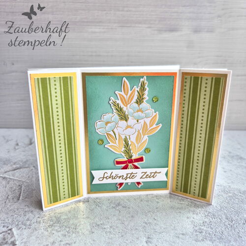 Die Karte ist nicht nur ein echter Hingucker, sondern auch unglaublich flexibel. Ihr könnt sie flach zusammenklappen, dekorativ aufstellen und nach Lust und Laune gestalten. Besonders schön wirkt sie mit Designerpapier, Goldembossing und ein paar Funkenpailletten – ein kleiner Zauber für die Weihnachtszeit!