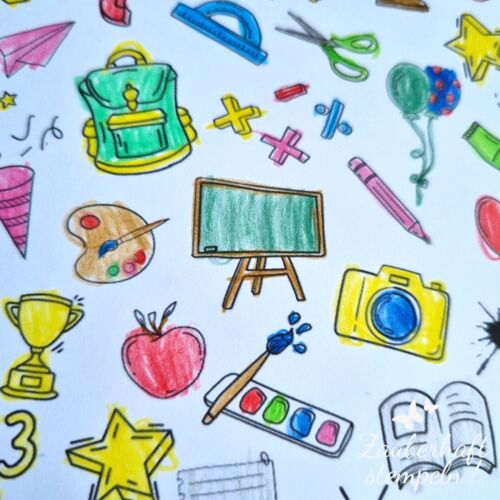 1 x selbst coloriertes Designerpapier SCHUL DOODLE in den Maßen 13,6 x 9,6 cm