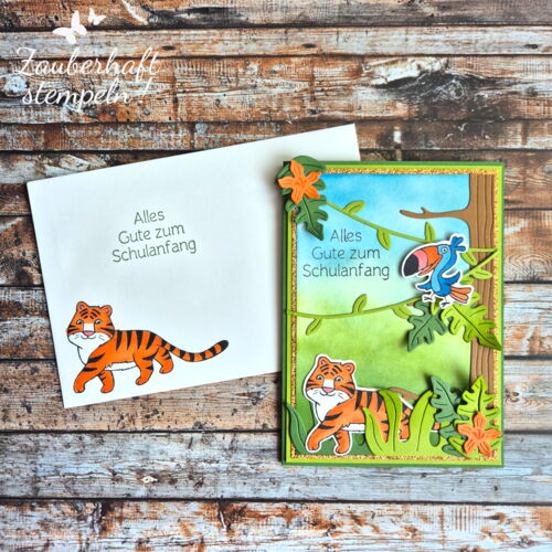 Die Schultüte hat als Motiv das süße Tigerchen - so wie in diesem Beitrag hier Schultüte kleiner Bastler. So war ganz klar, dass das Set JUNGLE PALS zum Einsatz kommt.