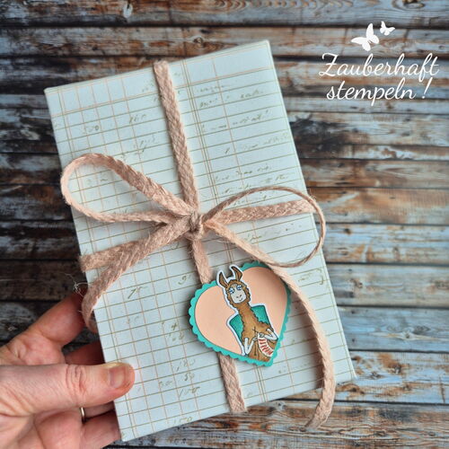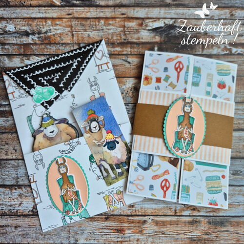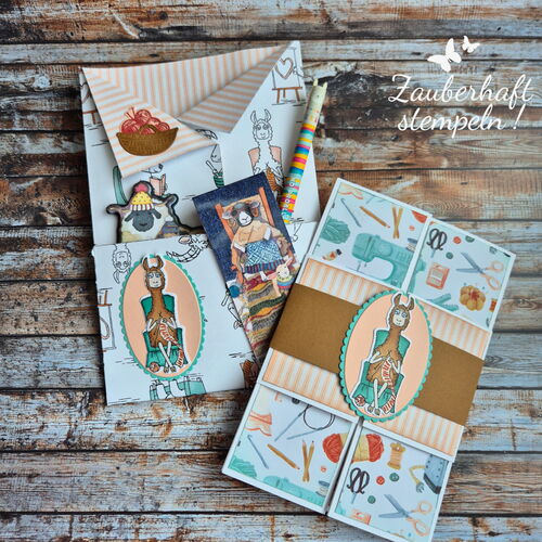 Unser Alpaka ist natürlich der Star der Karte – ganz entspannt im Sessel sitzend und fröhlich am Stricken. Farblich habe ich mit BLÜTENROSA, PEKANNUSS und JADE gearbeitet – eine Kombination, die einfach herrlich harmonisch wirkt.