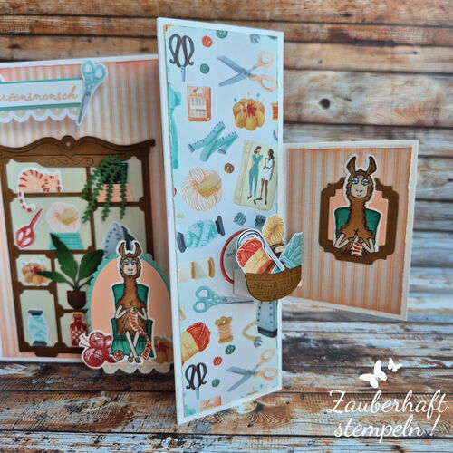 Mit zahlreichen Pop-up-Elementen, einem gemütlichen Bücherregal, vielen kreativen Details und natürlich unserem strickenden Alpaka mittendrin.