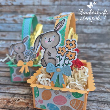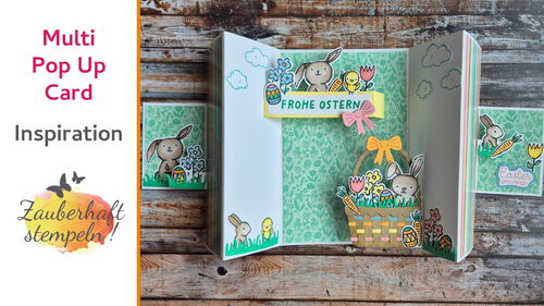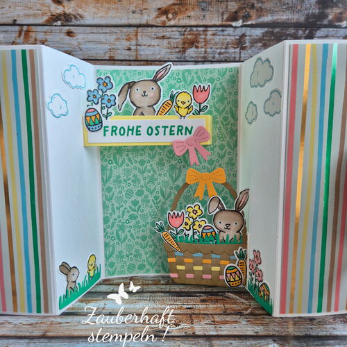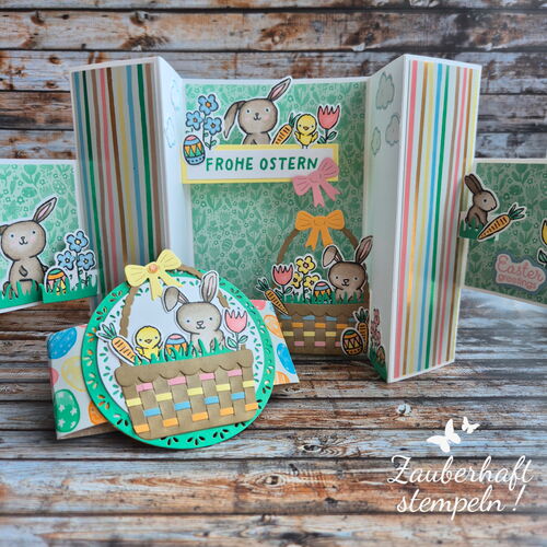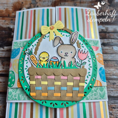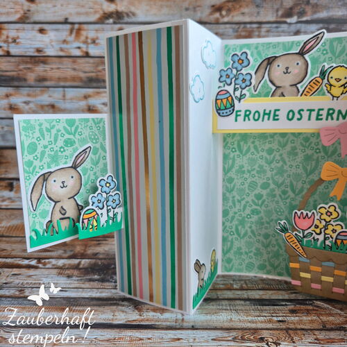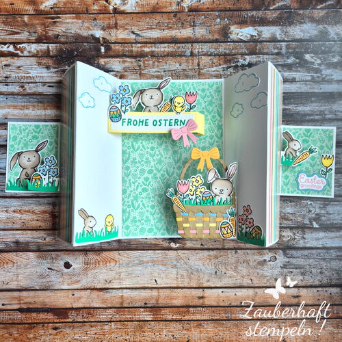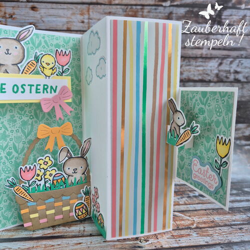 Mehrere Pop-up Elemente entfalten sich gleichzeitig – oben das Häschen, kleine Blümchen an den Seiten und unten ein üppig gefülltes Osterkörbchen. Ich wollte ganz bewusst, dass richtig viel los ist – verspielt, fröhlich und einfach voller Osterstimmung.