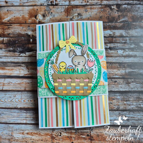 Etwas größer gehalten (12 x 18 cm), damit sie richtig was hermacht – perfekt auch als Deko am Ostertisch. Zusammengehalten wird alles von einer lockeren Banderole mit ausgestanzten Kreisen und natürlich meinem Häschen obendrauf 🐰