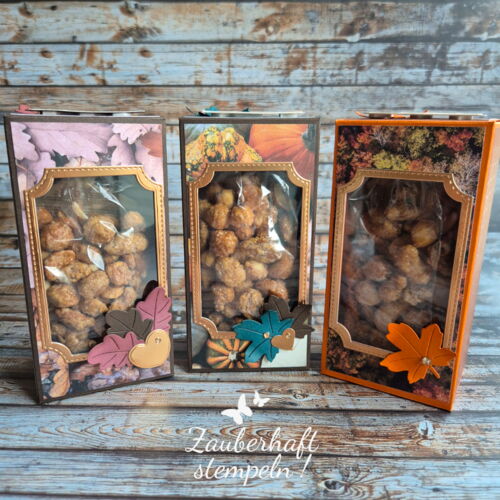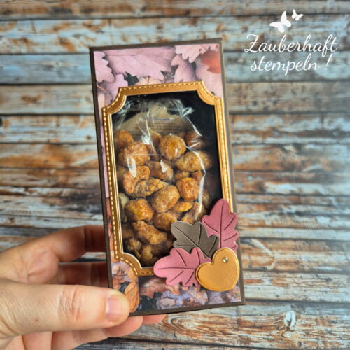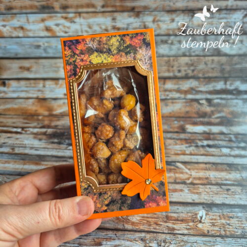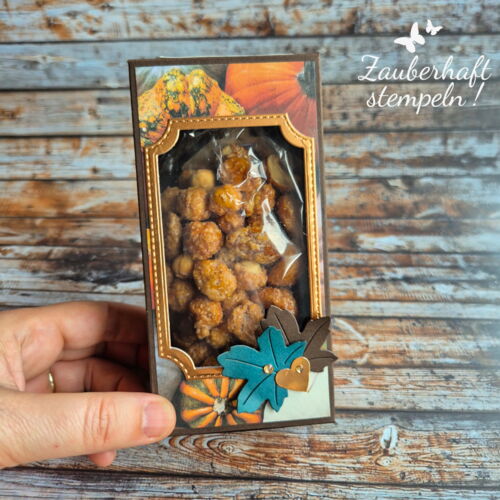 Ich habe in diesem Fall leckere gebrannte Nüsse von DM Bio verpackt. Die schmecken nicht nur lecker, sondern passen auch perfekt zum Herbst und somit zum Designerpapier HERRLICH HERBSTLICH.