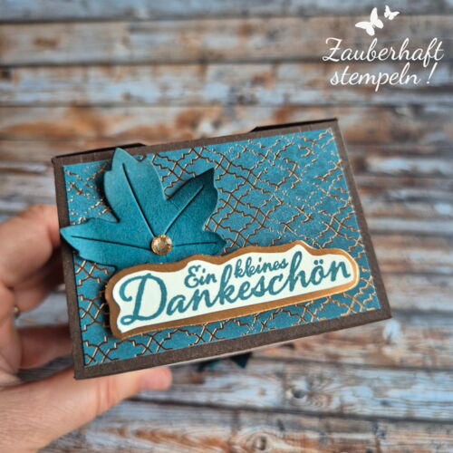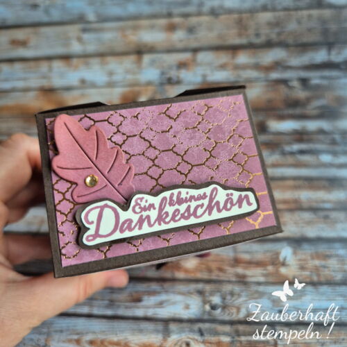 heute zeige ich euch eine sehr edle Herbstverpackung. Es ist eine Schaufensterbox mit großem Guckloch, das ich mit Kupferfolie umrandet habe. Sie lässt die Verpackung sehr edel aussehen und den Inhalt setzt sie perfekt in Szene.