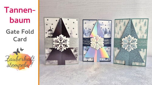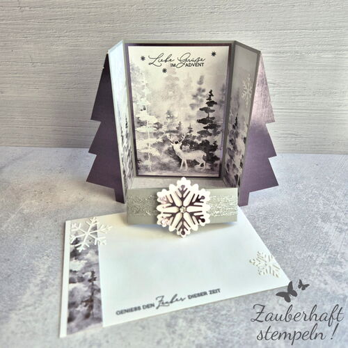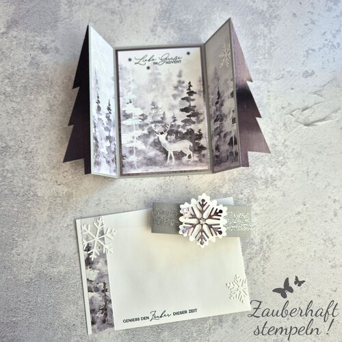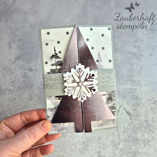 Graue Tannenbaum-Gate-Fold-Karte mit weißer Schneeflocken-Banderole, schimmerndem Designerpapier MAGISCHER WINTER und winterlichen Stanzdetails