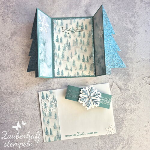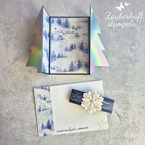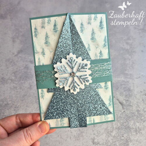 Aber das Highlight kommt erst noch. Während draußen bei –15° die Eiskristalle an meinen Fenstern glitzern, habe ich für euch eine Winterkarte gezaubert - meine Tannenbaum Gate Fold Card, die mir selbst den Atem raubt: ein Tannenbaum, der sich elegant auffaltet, funkelnde Schneeflocken, magisches Designerpapier und eine Banderole, die alles zusammenhält wie ein kleines Wintermärchen. ❄️🌲