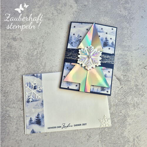 Marineblaue Tannenbaum-Gate-Fold-Karte mit funkelnden Schneeflocken, irisierendem Designerpapier und winterlichen Akzenten.