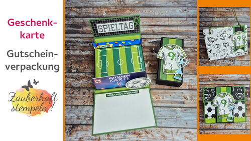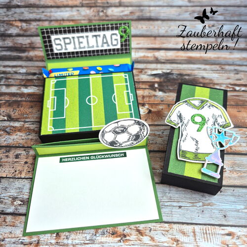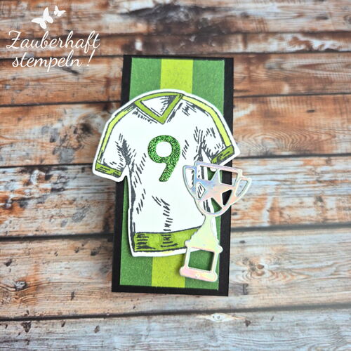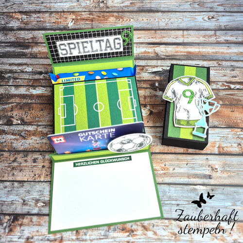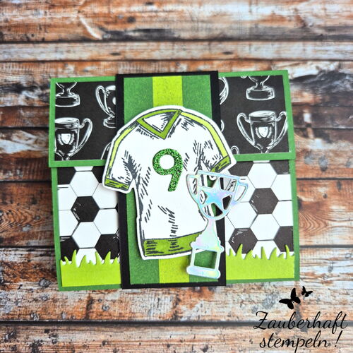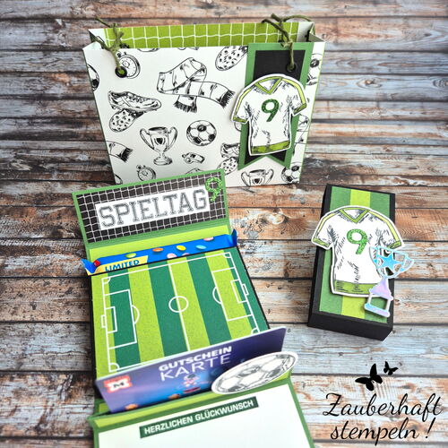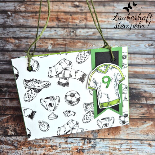 Für einen jungen Geburtstag – hier war es der neunte – sollte ein Gutschein hübsch verpackt werden. Damit alles gut transportiert werden kann, habe ich ein kleines Täschchen gestaltet. Vorne seht ihr das Trikot und das passende Designerpapier – und darin steckt dann die eigentliche Gutscheinverpackung.