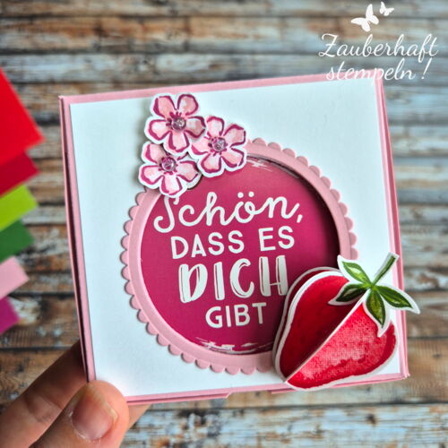 Ein bisschen Erbeer- und Blütendeko in passenden Farben und schnell habt ihr euer sommerliches Mitbringsel oder Dankeschön fertig.